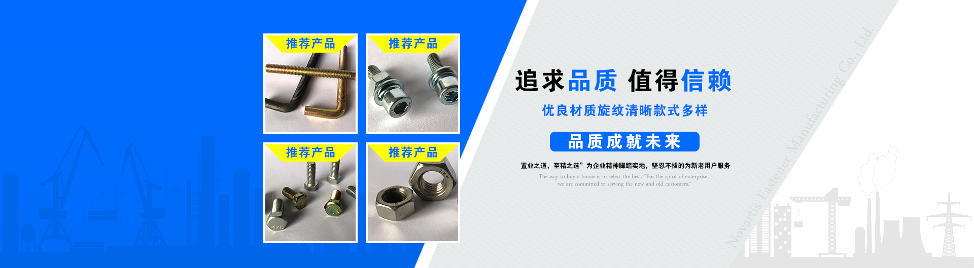 邯鄲市諾華緊固件制造有限公司是座落于中國標準件制造銷售的集散地——永年。地處燕趙大地,濱臨京廣鐵路、京珠高速,107國道,地理位置優越,交通便利。我公司主要生產銷售:銷軸、地腳螺栓、熱鍍鋅螺栓、滲鋅螺栓、鉚釘等產品。公司技術力量雄厚,生產設備先進,工藝精湛,檢測手段完善,實行現代化管理,先進的技術有了科學的經營體制承載,使得企業生產力迅速發展。自投放市場以來,以其優良的品質,合理的價格,獲得市場的認同...